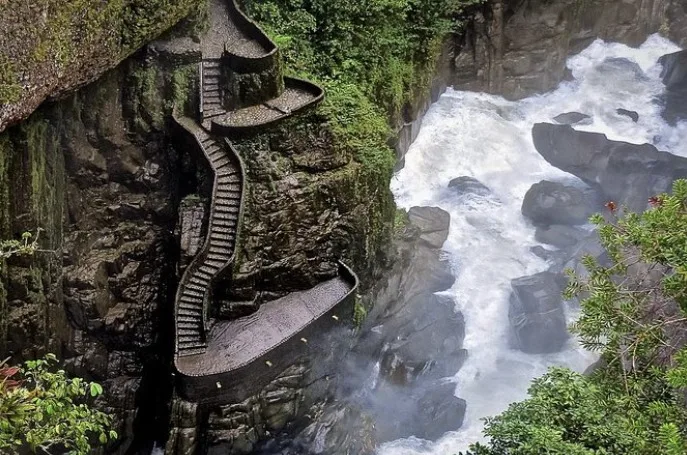 במסלול “ללכת דרך שער השמים”. בו נחצה את הקניון על גבי טרביטה (אומגה שהיא סל ) לצד השני של נהר פזטאזה río Paztaza. ונהנה מהמפל הזה כל כך קרוב אלינו! ולצלם את המפלים האדירים הכי קרוב שאפשר.